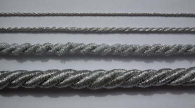 In den Stärken: 1 mm- 3 fach- 100 % metallisiertes Polyester. 2 mm- 3 fach- 100 % metallisiertes Polyester. 4 mm- 2 fach- Obermaterial- metallisiertes Polyester- der Kern (Seele) besteht aus Baumwolle. 7 mm- 3 fach- Obermaterial- metallisiertes Polyester- der Kern (Seele) besteht aus Baumwolle. Sehr edle Optik in Silber.