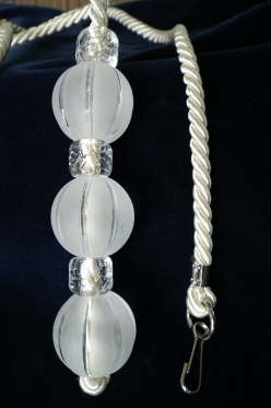 Gesamtlänge ca. 145 cm incl. Karabinerhaken (zum Auf- und Zuziehen von Gardinen etc.). Mit drei Rillenperlen ca. 3 cm in kristall matt und drei Perlen ca. 18 mm in kristall klar (aus deutscher Produktion).